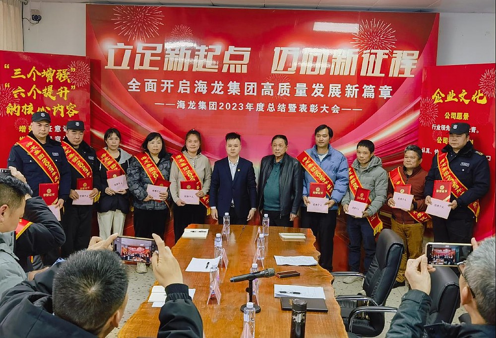 1月30日下午,海龍集團在浦北經營中心召開2023年總結表彰大會,總結2023年經營工作成效亮點,分析存在問題與不足,提出2024年的工作重點和任務。集團董事長彭國輝出席會議并講話,總經理彭大權代表集團公司作年度工作報告。集團財務顧問,各部門、各子公司負責人及優秀個人,天龍保安浦北金投分公司、浦北縣鑫浦瀝青有限公司全體員工參加會議。