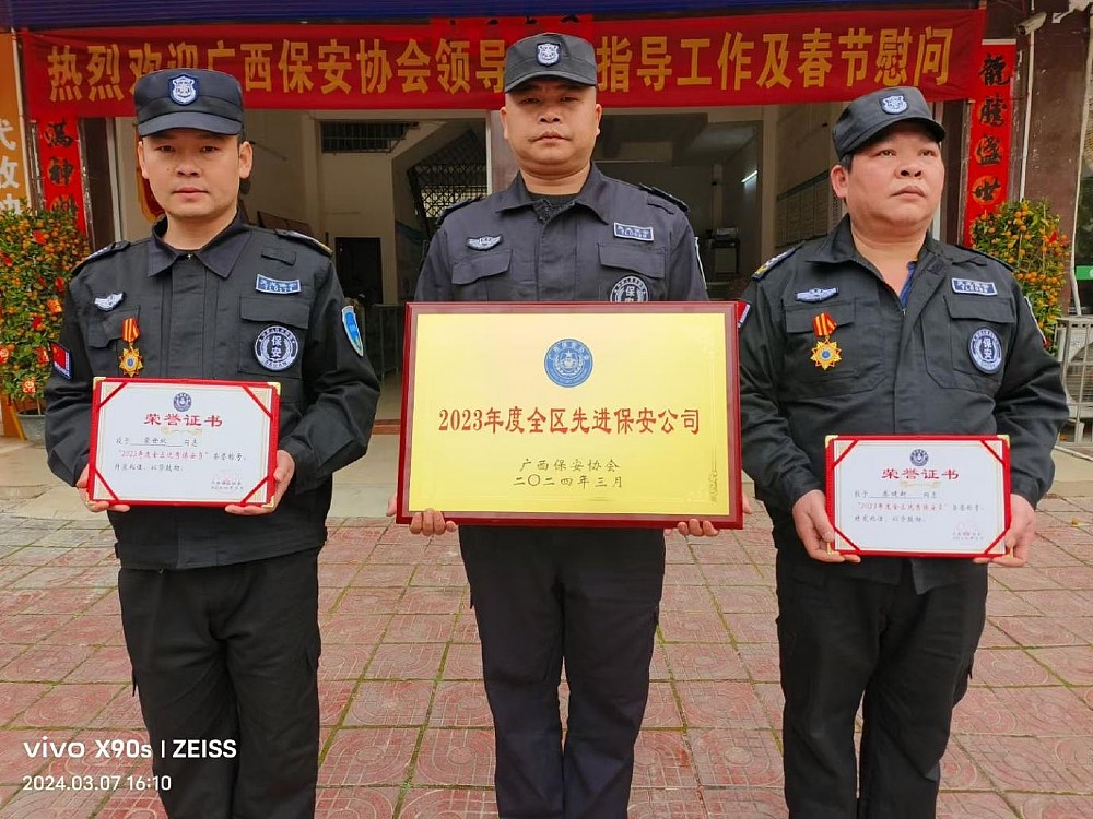 3月6日,廣西保安協會第九屆理事會第二次會員大會在南寧順利召開,大會對2023年度優秀會員單位和表現突出保安員進行了表彰,并頒發牌匾和證書。廣西天龍保安服務有限公司榮獲2023年度全區先進保安公司”榮譽稱號,公司蒙世秋、秦健新兩名優秀同志榮獲“2023年度全區優秀保安員”榮譽稱號。